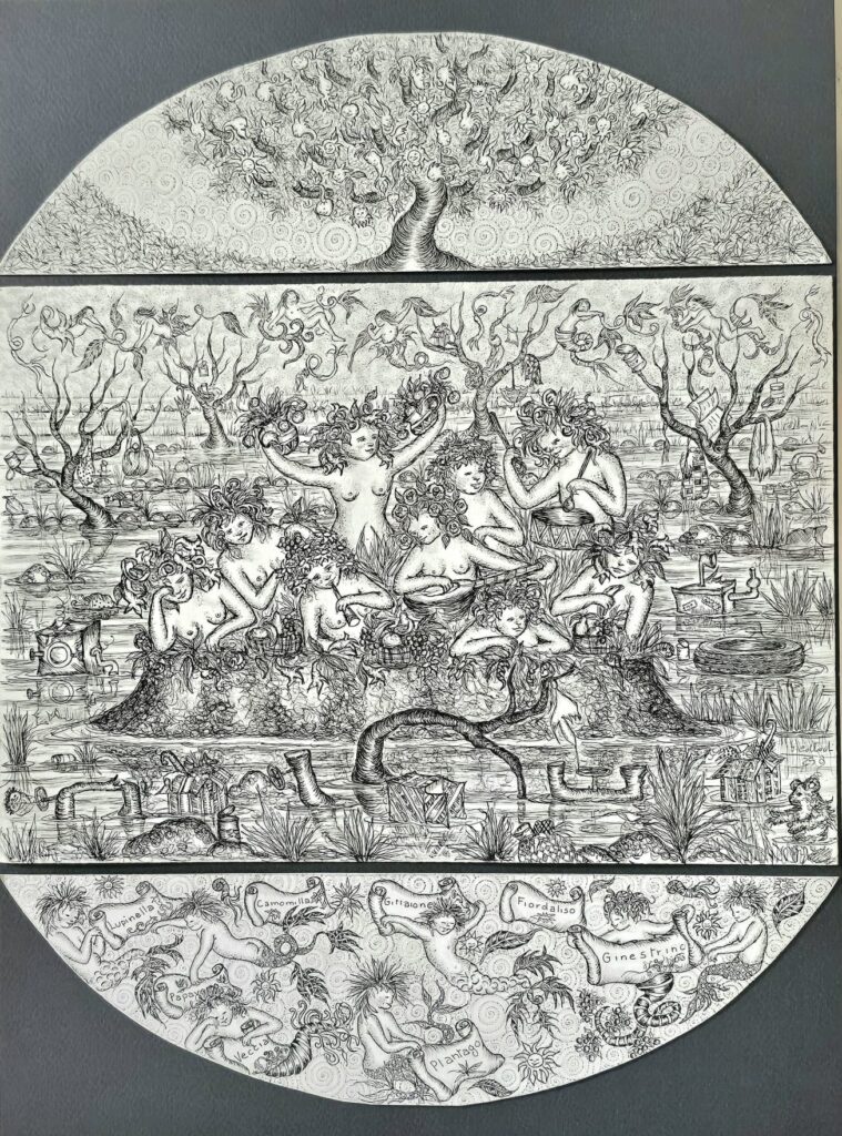 Le opere di Isabella Collodi si muovono in un territorio sospeso tra immaginazione, simbolo e narrazione visiva. I suoi lavori, ricchi di dettagli minuziosi e di una forte componente onirica, costruiscono universi in cui figure umane, animali e forme naturali convivono in equilibrio poetico. Tartarughe, elefanti, conchiglie, civette e chiocciole diventano presenze ricorrenti, ciascuna portatrice di un proprio tempo e di un proprio significato, come se appartenessero a un personale bestiario mitologico.