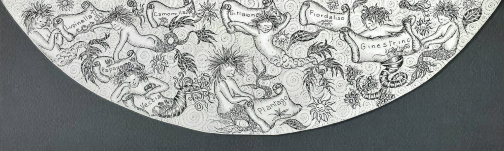Le composizioni spesso si sviluppano in strutture circolari o spiraliformi che ricordano rosoni, mappe celesti o giardini simbolici, invitando lo sguardo a muoversi lentamente tra centro e periferia dell’immagine. In questi spazi visivi, ricchi di ornamenti e segni sinuosi, l’osservatore è chiamato a perdersi e a ritrovarsi, costruendo interpretazioni sempre nuove.
